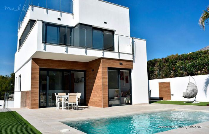 New residential of detached villas, in a fantastic area of La Nucia, close to the towns of Polop and Benidorm, with their extensive selection of daily services, shopping centres, bars and restaurants. As well as many leisure and entertainment activities, like an amusement park, a water park, golf courses, and water sports, which can be enjoyed all year ‘round, thanks to the temperate Mediterranean climate.These two-storey villas, with 3 bedrooms and 3 bathrooms, are built on plots from 204-287m2. The spacious ground floor is the main living area, with a combined kitchen, dining area and lounge, opening onto a partially covered terrace, garden and pool area. There is a double bedroom and bathroom on this floor too. There are 2 en-suite bedrooms on the first floor, with access to a terrace. The solarium offers incredible panoramic views of the sea and surrounding countryside. The basement comprises a multipurpose space of 48m2, as well as an extra bathroom and a laundry room.The villas are built with high quality materials, and offers various personalisation options.
