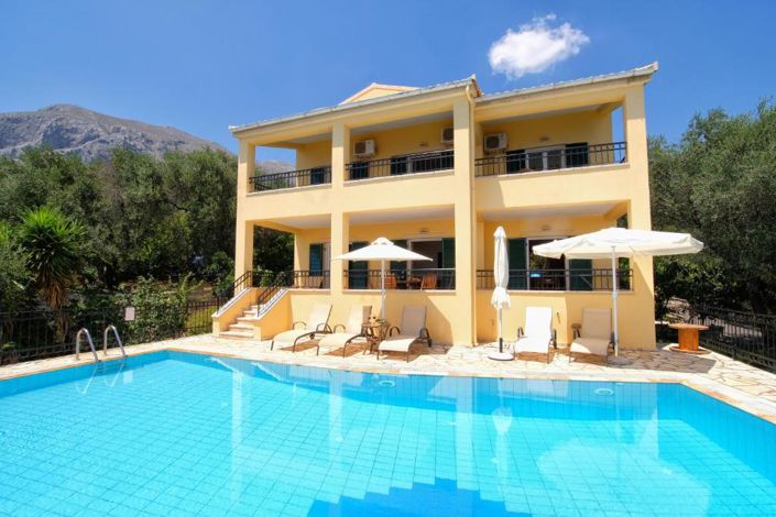 A four bedroom villa of 240sqm in a 800sqm plot, in the area of Nisaki Corfu island. The Villa is located in the area of Katavolos and is a spacious villa with wonderful sea and mountain views. It extends on two levels, on the ground floor and 1st floor. On the ground floor there is an open plan living-dining area with kitchen, which has access to a large shaded terrace overlooking the pool. There is also a WC at this level.