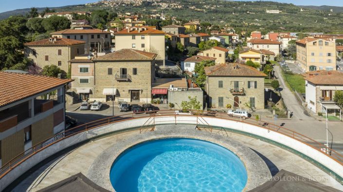 Unique opportunity, views of Cortona, style palazzo with luxury attic, roof terrace with pool, and three levels of retail areas for sale in Camucia. Set in a highly visible district just moments from the historic centre of Cortona, this property enjoys an exceptional position that naturally attracts attention and footfall, making it ideal for a wide range of business ventures and forward-looking investment projects. This multifunctional palazzo stands out for its sinuous architectural lines and its distinctive 1980s design, centred around a circular plastered façade. The building seamlessly combines a prestigious residential top floor with generous retail and retail areas, offering remarkable flexibility of use. Spanning 1,709 sq m/18,395 sq ft across six levels, it is internally connected by its central spiral staircase with elegant wooden steps, alongside a passenger lift/elevator and a spacious goods lift, ensuring both functionality and ease of movement throughout. The upper floors host an elegant private apartment of 331 sq m/3,563 sq ft, featuring a refined reception room with fireplace and wall-to-ceiling windows, a dining room, and a fully fitted kitchen. The living area is finished in traditional terracotta, while the sleeping quarters, laid with parquet flooring, comprise three spacious bedrooms and two bathrooms, including an ensuite with distinctive red tiling and wooden fittings. The top floor attic is the true signature of the property: a rare and captivating space where a generous size reception room with curved windows opens onto a spectacular panoramic roof terrace. Here, a circular swimming pool enhances uninterrupted views over the rolling hills and the iconic skyline of Cortona, creating a setting that is both exclusive and unforgettable. The three above-ground levels dedicated to retail offer expansive open-plan layouts with industrial concrete floors and full-height windows, perfectly suited for showrooms, flagship stores, or innovative commercial concepts. The 595 sq m/6,404 sq ft basement level provides a well-organised logistics area, storage rooms, and a second access, supporting efficient operations. The property is further complemented by 1,144 sq m/12,313 sq ft of external space, ideal for parking and goods handling. Combining high visibility, generous volumes, and a unique residential penthouse, this palazzo presents a compelling opportunity for those seeking a prestigious headquarters with integrated private living, or for investors aiming to capitalise on a redevelopment project with potential change of use. A property that invites vision and rewards ambition: contact us today to explore its full potential and secure a standout asset in one of Tuscany’s most sought-after locations. PROPERTY Ref: COR3607Location: Cortona (Camucia), Province: Arezzo, Region: TuscanyType: 1,709 sq m/18,395 sq ft town palazzo arranged over 6 levels consisting of a penthouse and retail surfaces, terraces, rooftop poolOutdoors: 1,144 sq m/12,313 sq ft courtyardYear of construction: 1980Conditions: goodTerrace/Balcony: 2 terraces, 40 sq m/431 sq ft loggia and panoramic roof terraceSwimming pool: circular panoramic pool, set into the roof terrace, with views over CortonaParking: outdoor and storage room on basement levelLayout: Basement Level: 595 sq m/6,404 sq ft, with storage room, warehouse, exhibition area and 2 bathrooms Ground Floor: 251 sq m/2,702 sq ft, with shop entrance, exhibition area, offices and goods lift First Floor: 306 sq m/3,294 sq ft, showroom with terrace Second floor: 226 sq m/2,433 sq ft, exhibition area Third Floor: 331 sq m/3,563 sq ft penthouse comprising living room, dining area, fitted kitchen, 3 bedrooms, 2 bathrooms and terrace Fourth Floor: panoramic terrace with swimming pool, 1 bathroom and reception roomAll floors are connected by a comfortably sized spiral staircase, in addition to a lift/elevator and goods liftDistance from services: on foot Distance from main airports: Perugia 57 km/35 miles, Florence 126 km/78 miles, Rome 231 km/144 milesUtilities: Fixed telephone network: availableInternet: available eoloHeating: mains gas with radiator systemWater: mains city supplyElectricity: availableWater waste: mains city connectionThe property is owned by a private individual. The location, for privacy, is approximate. Please note all measurements cited are approximateEnergy Efficiency Rating: GApolloni & Blom RE conducts technical due diligence with the owner's technician to have a full report on each property's urban and cadastral state of the art. The due diligence may be requested by clients showing a strong interest in the property.