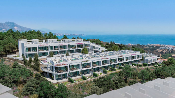 The living areas are designed to maximize natural light through an orientation that faces the sea. These spaces connect to the outdoors, allowing for natural ventilation and movement between the interior and the terraces. High-end materials and efficient construction technologies are used throughout the residences to meet modern standards for comfort and long-term durability.