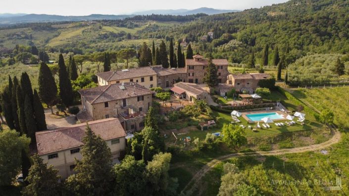 Prestigious 136 hectares historical estate with villa, chapel, holiday homes, 2 pools, vineyards, winery, olive grove, for sale in Greve in Chianti. Deep within the rolling contours of the Tuscan landscape, lies an estate of singular prestige and historical resonance. Positioned near the storied Verrazzano Castle in the heart of Greve in Chianti, this ancient hamlet offers a unique synthesis of aristocratic heritage and a flourishing viticultural enterprise. Spanning an expansive 136 hectares (336 acres), the estate is anchored by a noble style 19th-century main villa, ì that commands views over a landscape unchanged in its essential beauty for centuries. This principal residence, spanning generous proportions with six air-conditioned double bedrooms, serves as both a sanctuary for private living and a sophisticated venue for high-end hospitality. Its interiors transition seamlessly from a farmhouse kitchen warmed by an original fireplace to elegant lounges that open onto manicured gardens and a private swimming pool, offering an atmosphere of refined rural repose for up to 12 guests. The hamlet’s architecture radiates outward from this central manor to encompass a collection of traditional stone buildings, currently configured into 6 apartments. These dwellings, serviced by their own dedicated swimming pool, provide an additional capacity for 21 guests, making the estate a premier destination for agritourism. The spiritual heart of the hamlet is also found in its private chapel. Totaling some 2,685 square metres (28,900 sq ft) of surface area, the built environment is a masterclass in Tuscan vernacular, featuring 1,800 square metres dedicated to living and hospitality, while the remaining 885 square metres comprise the engine room of the estate: a professional winery, tasting rooms, and various agricultural annexes. The agricultural prowess of the estate is formidable. Of the vast acreage, 19.7 hectares are under vine, with 17 hectares dedicated to the prestigious Chianti Classico DOCG and 2.7 hectares to IGT Toscana. The winery facility includes a recently constructed 400-square-metre cellar, where production boasts an impressive portfolio ranging from robust reds and IGT Rosso to delicate Rosé, Bianco, and the traditional Vinsanto. Complementing the viticulture is a 20-hectare olive grove, where 4,000 trees—Moraiolo, Leccino, and Frantoio—yield an annual 5,000 litres of IGP and DOP oil. Beyond the cultivated land, the estate dissolves into forest, pasture, and arable fields, ensuring total privacy and an unbroken connection to nature. While the primary residential structures are in excellent condition, several outbuildings offer the tantalising opportunity for further restoration, allowing a future custodian to leave their own mark on this quintessential Chianti stronghold, located a mere 38 kilometres south of Florence. PROPERTY Ref: FIR2143Location: Greve in Chianti, Province: Florence, Region: TuscanyType: 136-hectares/336-acres winery estate paired with a 2685 sq m/28,900 sq ft ancient hamlet consisting of 1800 sq m/19,375 sq ft surfaces dedicate to living and hospitality featuring a 19th-century main villa with 6 air-conditioned double bedrooms and a swimming pool, a private chapel, 6 holiday homes/apartments 2680 sq m/24756 sq ft serviced by a separate swimming pool, along with 885 sq m/9,526 sq ft of agricolture annexes including a winery facility with tasting rooms, and several deposit/warehous