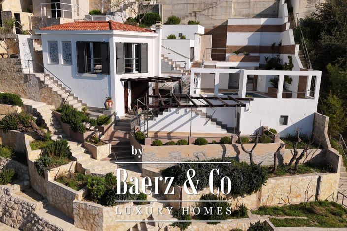 Sited on a 650 m² plot, the estate comprises three distinct units with a total of five bedrooms and five bathrooms, designed for flexibility and privacy. The Beach House presents a bright, compact retreat directly by the water, while the lower duplex apartment, already renovated and fully rental-ready, features a fluid connection between living, dining, and the sea-view terrace—its current rental performance reflects a guest rating of 10.0 and seasonal net income of approximately €40,000. The upper duplex, with two terraces, offers an inviting canvas for renovation, with architectural concepts available.