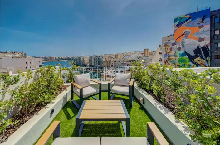 Nestled in the vibrant heart of St Julian’s just steps from the lively seafront promenade, fine restaurants, beaches, and nightlife, this exquisitely finished two-bedroom Duplex Maisonette, offers an irresistible blend of sophistication and romance. Spanning approximately 105 square metres, the residence welcomes you with an elegant entrance and a staircase leading to the first floor that opens on to a refined living area and a serene bedroom suite complete with ensuite and study space, while the first floor hosts a second private ensuite bedroom and a sleek, fully fitted modern kitchen with dining area opening onto a charming terrace — perfect for candlelit alfresco evenings. Crowning the home is a beautifully finished private rooftop retreat designed for relaxation and entertaining, where you can unwind while admiring enchanting views of Spinola Bay. A truly distinctive property, finished to exceptional standards and ready to move into, offering luxury living within walking distance of every convenience.