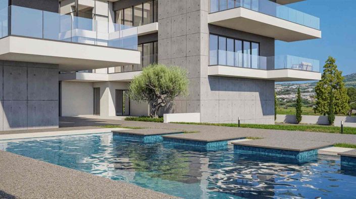 Most apartments offer excellent sea views. The development features a communal swimming pool, modern design with sleek lines, large windows, and concrete finishes.
