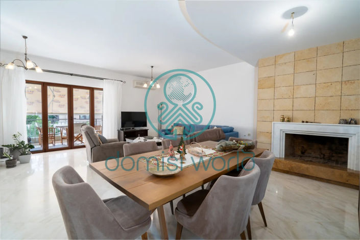 It has three comfortable bedrooms with built-in wardrobes made of despotaki wood and oak floors, a bathroom and a WC. The exterior frames are aluminum with a wood finish (Doral), with double glazing and screens. There is a solar and electric water heater, autonomous central heating (oil), air conditioning, a domestic desalination unit as well as a water filter in the kitchen of the apartment (Veluda).