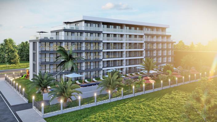 The residence occupies a 3,975 m² plot and offers multiple modern features for a comfortable and secure lifestyle: an Olympic-size swimming pool along with a separate children’s pool, landscaped gardens with walking paths, and shaded sitting areas with gazebos. Residents can enjoy access to a fitness center and a sauna. Families with children will appreciate the on-site playground. The safety is provided by a color IP camera system and 24/7 CCTV surveillance. There is also a central generator to provide uninterrupted power and an indoor parking area for convenience. The buildings are equipped with elevators and reflect a contemporary architectural style. The project includes 52 residential units, offering studio, one-bedroom, and two-bedroom apartments, as well as 8 commercial spaces on the ground level.