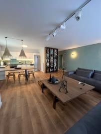 Open-plan design: bright single space with sleek kitchen, living-sleeping zone a...