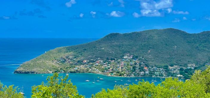Over Admiralty Bay in lush mature gardens on hillside above Princess Margaret Ba...